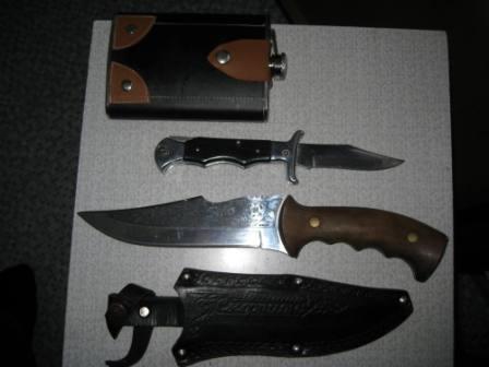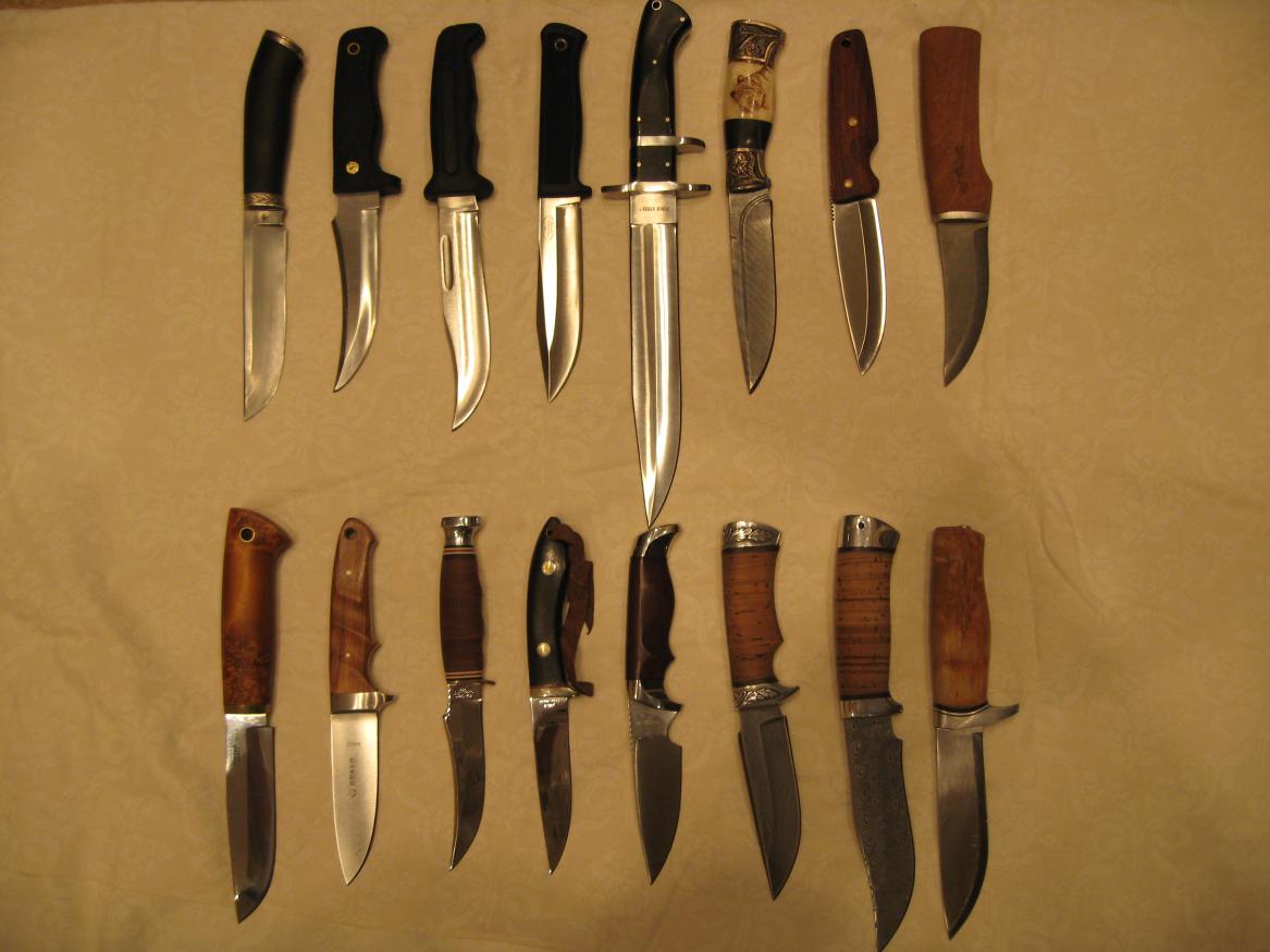 Мои ножи.Кизлярский Скорпион куплен непосредственно на заводе,номерной,в билет записан.На практике крупноват.Для колбаски обычный складной.На охоту всегда беру брусочек марки АЗК36М40.2-3 движения и подправил.