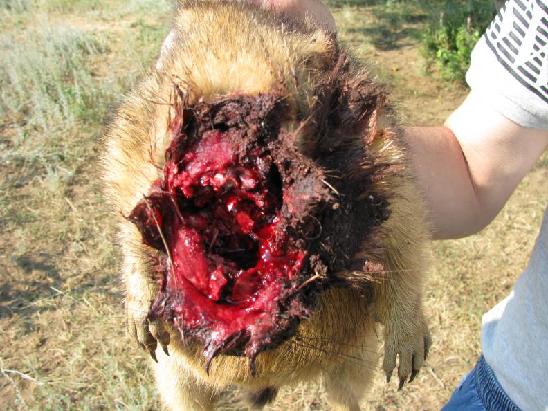 Фото не для слабонервных (18+). Сурок сидел в пяти метрах от сурчины и с такой дырой в голове добежал до норы и в нее упал. Хорошо, что на вытянутую руку можно было достать. И такой случай в моей практике не один. Поэтому всегда бью полуоболочкой и в голову. Голова все равно в хозяйстве не пригодится. Извините если, что не так.
