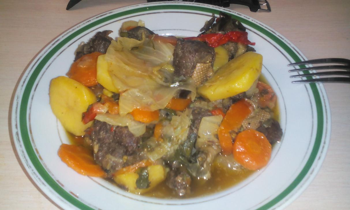 Получилось просто супер! Ум отъешь! Гусик получился очень мягким, овощи пропитались гусиным соком. Мясо от костей предварительно отделили. В закладку добавили несколько зубчиков чеснока. Во время приготовления поставил на крышку три литровые банки с водой, чтобы "дух" из казана не выходил!