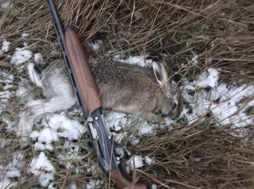 Открылся сегодня нетрудовым зайцем. Был на охоте всего 15 минут. Следы нашёл как только въехал в угодья. С дороги заяц ушёл в пахоту. Я сразу понял что заяц залёг где то рядом. Но в пахоте следов не видно и по этому мне пришлось просто прочесать местность. Заяц встал у меня за спиной и зачем то побежал мимо меня метрах в 50. Выстрелил по нему 3 патрона и думал что промазал, так как заяц летел не сбавляя скорости. Но пробежав ещё метров 70-80 ушастый упал и забился. Я и не надеялся даже на такое завершение охоты. Одна дробина №2 по грудине на вылет и это на 50 метрах. Просто везение.