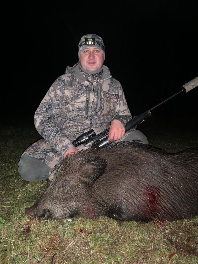 … «тишина то какая» вдохнул я уже прохладный но очень свежий воздух… Нравится мне здесь на Родине – нет ни шума машин, ни людей, только поля и леса родного региона… (надо будет постик сделать про деревни заброшенные) . Пропиликали мы 300 км в одну сторону, отдохнули, выспались, плотно подкрепились и теперь стоим с карабином и другом Ваней посреди полей – ждем кабана. На поле, как обычно неожиданно, стали выходить косули, мелкие, крупные, одиночки и тройки, но мы ждем другого «клиента». Часа полтора наблюдали, решили пройти по полю до вершины и оттуда понаблюдать. На вершине увидели яркие точки зверей, скучковавшиеся в стадо, очевидно кабаны… «А ну пойдем»… Расстояние приличное, а поле не ровное – низина, подъем. С километр протопали, нет кабанов… «А где они»? Заходим правее, слева косуля с косуленком взрослым, козел поодаль одиночка ест что то, вдалеке пары и тройки косули. «Ну, не улетели же они?» Правее заброшенный поселок, смотрим кабаны наши чешут во всю прыть, в противоположную сторону от нас… «ЭХ, досадно…» Странно, косули нас не причуяли, а эти срисовали… Правда на улице безветрие, наверное подшумели. Уже пошли тихонько в обратную сторону, к машине, тихонько, не пугать же пасущихся косуль. Опять проходим эту самку с взрослым косуленком, опять одиночного козла, который все еще ест… СТОП! Странно, что этот «козел» ни разу голову не поднял, а я смотрел на него довольно часто, самка в нашу строну постоянно смотрела, а он от нее на расстоянии 100 метров…. «Вань, да это секач пасется!». Иван перехватил гляделку – «Секач, Лех!» Мы мимо его раз пять проходили, ему хоть бы что. Кабан стоял на границе низины, поэтому мы видели только половину его, до него 250 метров. Идти очень тяжело – хруст страшный. Крадясь мы смогли подойти на 160 метров, далее «клиент» занервничал или уже наелся, не поняли толком, только он начал по этой бровке активнее перемещаться, как будто мышкует…. «Уйдет, не хер медлить, давай!». Карабин на плечо моего друга, прицелился, в голове промелькнула мысль «в голову могу промазать…» и выбрал целью я лопатку, надежно же? Не надежно! Стрелять надо наверняка, а не на удачу. И друг мой ругался не просто так, да он всегда на меня ворчит…))) Выстрел! За лопатку, точный выстрел… Только кабан побежал в противоположную сторону… Как побежал? Очень просто – хромая. Попадание было перед ляжкой, я перепутал где голова у кабана, то ли от невнимательности, то ли он повернулся в моменты наших перемещений… Хорошо, что эта история закончилась удачно, а если бы нет? Ушел и «пропал» бы зверь, расстройства, сгоревшая лицензия, «думки разные»… Кабан пробежал 200 метров и встал, стоял он минут 5, а мы на всех порах приближались к нему. Подошли, добрали… Начался мелкий дождь… Хороший секач, кг под 120-140 наверное, грузили вдвоем ровно час, вспоминать не хочется )))) … |