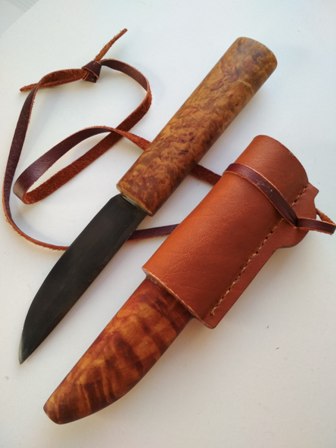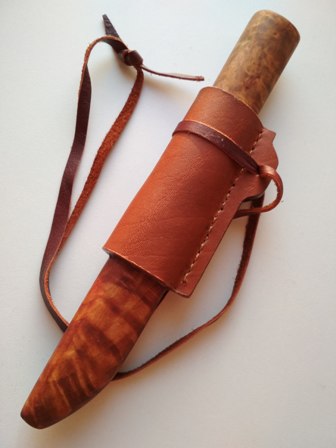 Деревяный вкладыш пробовал делать из лиственницы, т.к. не разбухает и клинить клинок не должно, но она оказалось очень твёрдой и колкой, те резцы, что были под рукой - не брали или портили заготовку, глубоко зарываясь. В плане попробовать фрезой из сверла заточенной, но в народных промыслах, явно, обходились проще. Советуют из липы т.к. легко режится и делают ложки и т.п. свистульки. Выбрать под клинок в двух половинках и склеить, а дальше мокрой кожей как описано выше. Жду советов.