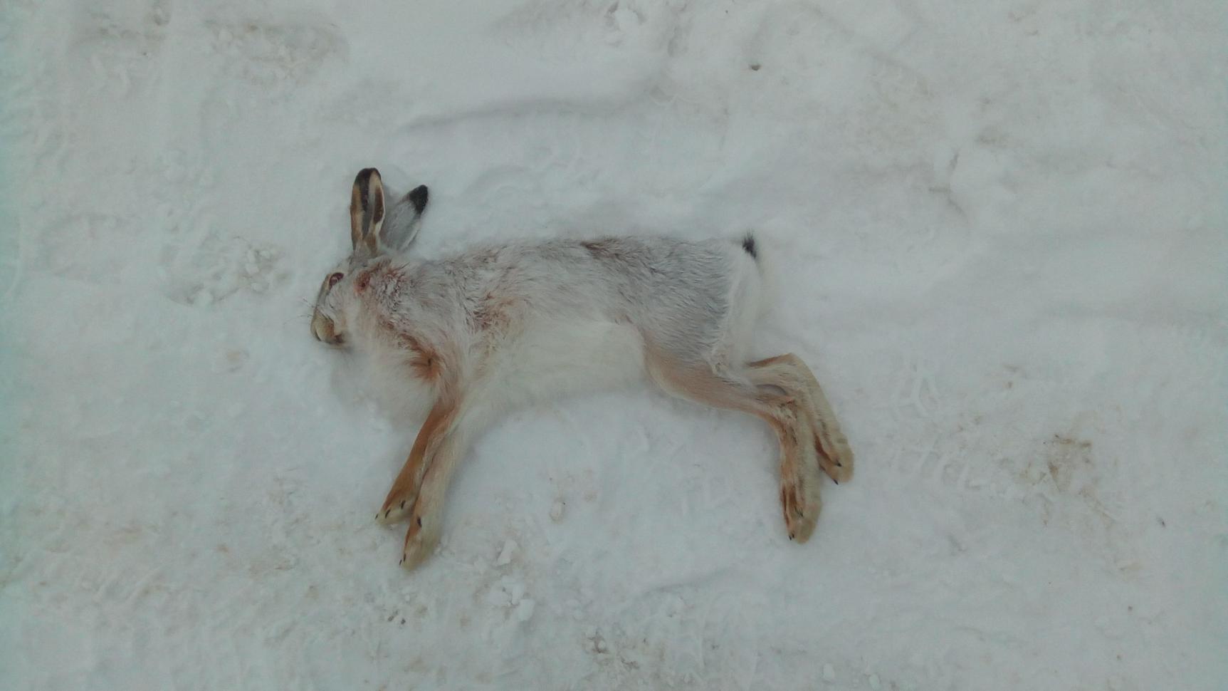 Сегодня решил прогулять своих лайкоидов. Долго думал брать или нет ружьинко, решил взять, а так как стрелять особо желания не было, бросил в карман 4 патрона двойки...так на всякий случай...а вдруг "война"...В общем едем, точней я еду, собачки спортом занимаются, впереди машины бегут. Так продолжалось километров десять, пока не наткнулись на заячий след. Остановился, посадил своих подопечных в машину(они у меня с зайцем не знакомы), а сам думаю дай посмотрю, что там зайчик на снегу "написал"... 20 минут "чтения" и вот она скидочка. Вот тут охотничий азарт и проснулся, пошел к машине за ружьишком, по пути созвонился с товарищем. Место такое, что одному не перекрыть возможный отход зайца. Короче пять минут охоты один выстрел и... теперь уже я и заяц едем в машине, а собачки спортом занимаются, впереди машины бегут, только уже в сторону дома...