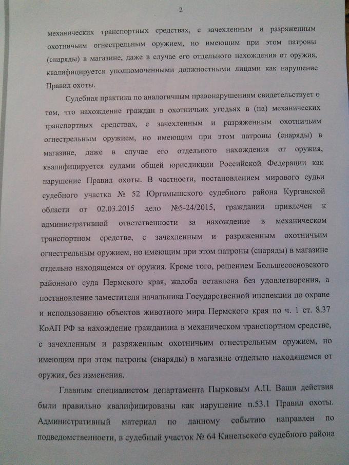Уважаемые форумчане. Помогите пожалуйста разобраться в одной неординарной ситуации... Сегодня с утра по темну решили прогуляться по Богатовскому ОДоУ.Выехали пошерстили по полям,как обычно многие километры нарезали,следочка даже одного не увидев погнали домой. Перед Малой Малышевкой решили свернуть в лес перекусить передохнуть и прочее. Отдохнув тронулись дальше.Хотели выехать на трассу,но тут на пути Нива и Уаз буханка.Подходят представляются,удостоверение и все как надо. У братишки моего по охоте Тозик в чехле разряженный все как положено. У меня Саежка 12 ая тоже в чехле,патронник пустой. Но магазин снаряженный пятиместный,который находиться в сумке,которая висит на шее,вместе с документами и телефоном. И вот оно самое интересное.... Инспектор Пырков,говорит о том,что мной нарушены правила охоты и он сейчас будет составлять протол об административном правонарушении. Якобы мной был нарушен пункт статьи 53.1 правил охоты от 16.10.10. Я никогда негде не слышал о том что не примкнутый к оружию магазин нужно перевозить разряженным. Пытаясь Пыркову объяснить,что магазин подствольный и магазин съемный это разные вещи,нечего не добился,он показывал правила охоты и объяснял обратное.Завтра еду в департамент объясняться. Вот кто что скажет,кто не прав я или инспектор Пырков,который составил протокол об административном правонарушении ????????