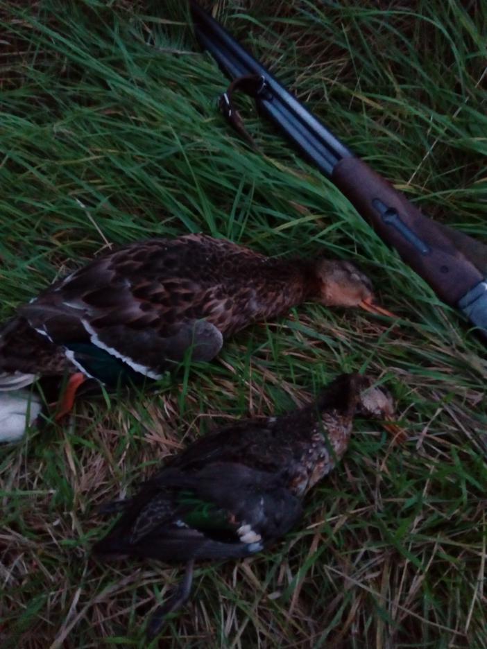 Расписывать красиво не умею, по- этому краткий отчет —с подхода кобель поднимает крякаша, стреляю и тут же взлетает чирок. Краем глаза успел заметить, что крякашик летит, но как то на один бок заваливается и за деревом не видно, куда дальше полетел. И полетел ли. А чирок вижу камнем упал. Кобель ,как обычно, проморгал место падения. Пришлось направлять в нужную сторону. Пока перезаряжался чирок был найден и доставлен в руки. Пошел крякаша искать с кобелем напару. Поляну собакен прочесал и на меня смотрит. Типа че ты меня сюда загнал, нет тут ниче. Ладно, думаю, нет так нет, вышел на дорогу и полез за сигаретой. Кобелино тоже выбежал и так, неспеша побежал по дороге. Наверно подумал, что дальше пойдем. Смотрю нашел чето. А далеко, не видно. Блин, несет крякашика)). Ну а третий налетел со второго раза под выстрел.