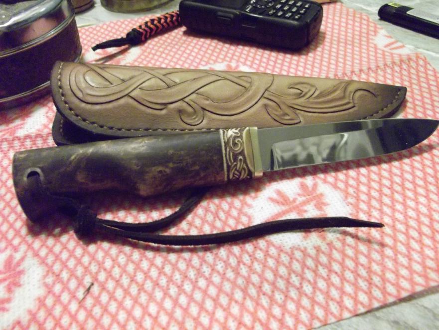 Ножны сшиты вручную (кожа-"фанера"), рукоять-березовый кап,гарда-латунь,рог лося,темляк.Заточка-бритва.Нож разработан,изготовлен и собран Романом Серковым ("мастерская Романа Серкова" г.Самара). Вашему вниманию....тот маленький клин...и воот он результат...ручная работа Романа Серкова...