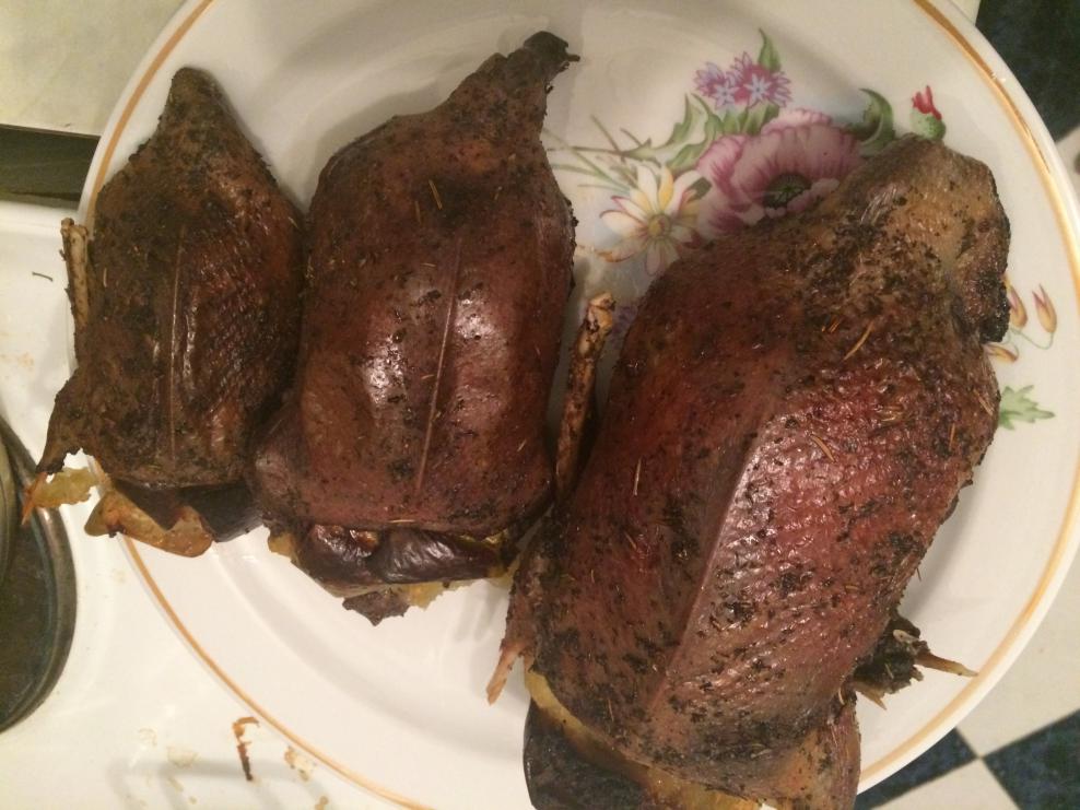 02.10. юбилей у сына (10 лет), запрос был понятен: хочу блюдо из дичи ... Хочешь - нати... Рецепт бешбармака я выкладывал ранее, повторюсь: мясо косули, барашка (у меня смесь) отвариваем в соленой и перченой воде с луком часа 1,5. За 15 минут добавил розмарин, зубчик чеснока ... Мясо отваренное выложил на большую тарелку а в бульене отварил тесто кусочками (декоративные в этот раз))). Выложил по краям тарелки отваренное тесто и посыпал все свежей зеленью... Ели мясо и запивали шурпой из чашек))... На второе утки (тоже разные) - чирок, чернеть, кряква. Замариновал на сутки в соли, прованских травах и внутрь свиного сала добавил... Выложил на противень с зелеными яблоками и запекал в духовке 1 час.))