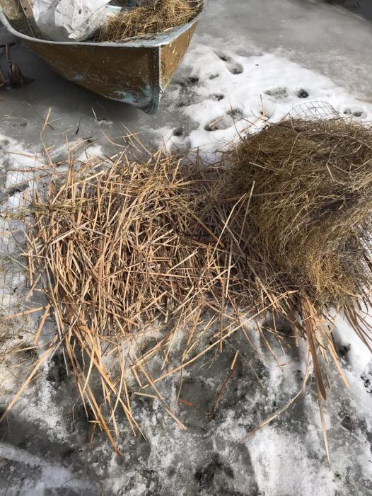 А тут фотографии еще двух гнезд которые стоят 11 месяцев и были набиты только сеном. Хорошо рядом были островки со льдом и снегом, не пришлось тащить их на берег. Отремонтировал на месте и установил обратно, так же осадив ниже к воде.