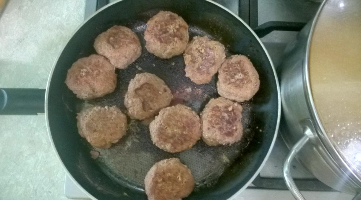 Крутим мякоть через мясорубку. Затем морковь,лук репка, зеленые побеги чеснока. Смешиваем всё вместе, добавляем пару яиц, соль, карри, суп томатный и стакан молока. Всё перемешали и на сковородку где растоплено кабанье сало. Приятного аппетита.