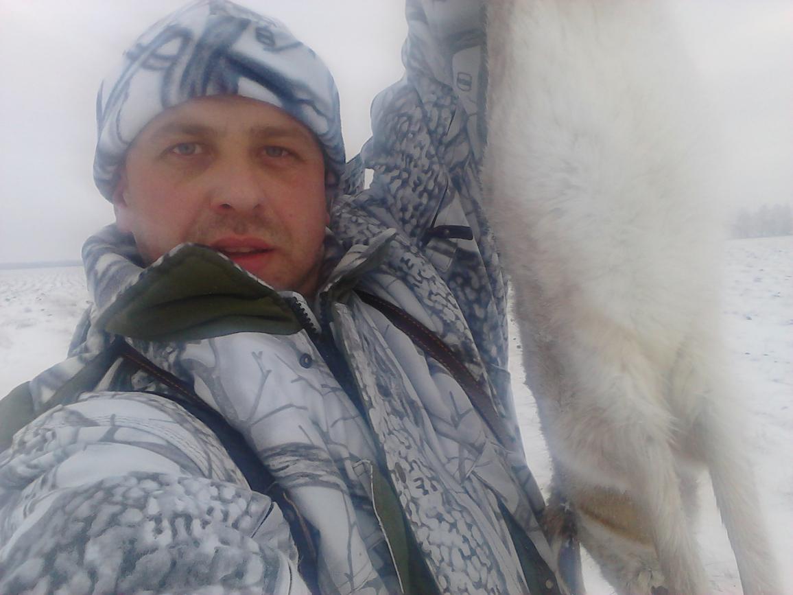 21.12.2011 Чёто не хотелось работать и я решил сгонять потоптаться малость,звоню брату тот не может,звоню одному товарищу (тот не может),звоню другому (тот тоже не может),звоню ещё одному тот уже на охоте (на копыта уехал).Ну думаю ладно,один поеду.Пошёл в гараж, взял лыжи,прицепил прицеп со снежиком и поехал.Доезжаю до угодья,скидываю снеж и по газам.Пролетаю два поля,замечаю много следов(не разобрать ,где свежак,а где нет)ну да ладно проезжаю по кругу (радиусом примерно метров 150)и вижу три выходящих следа,ну всё думаю сейчас выберу один и по нему пойду(угадал или не угадал,как повезёт),загоняю снеж в посадку,накидываю белый тент,встаю на лыжи и по шкандыбарил по одному из следов.В общем пошёл я примерно около километра как вдруг кончился снег на поле(озимые покрыты слоем льда,а снега сверху нет)ну всё дальше тропить не имеет смысла,я развернулся и пошёл обратно,иду и думаю (блин а на фига я опять своим следом иду обратно,когда вон не далеко посадочка,а за ней скошенный подсолнух)поворачиваю и туда.Захожу на поле,а там следоооооооооооов,мама не горюй,ну всё думаю поехал я домой,и взял курс на снеж,иду но по сторонам поглядываю в напряжении,мало ли что,и только я расслабился и отвлёкся как тут метров в 7 с права от меня выскакивает степан и дёру,я в суете пытаюсь развернуться что бы принять удобное положение для стрельбы(ведь он выскочил с неудобной стороны)но мне не дают быстро развернуться(стою на лыжах)палки от подсолнуха(лыжи в них упираются).От безнадёги беру Сайгу 20 в правую руку и стреляю одной рукой как из пистолета,на моё удивление заяц кувыркнулся один раз,подпрыгнул на пол метра в верх и затих(всё заяц взят).