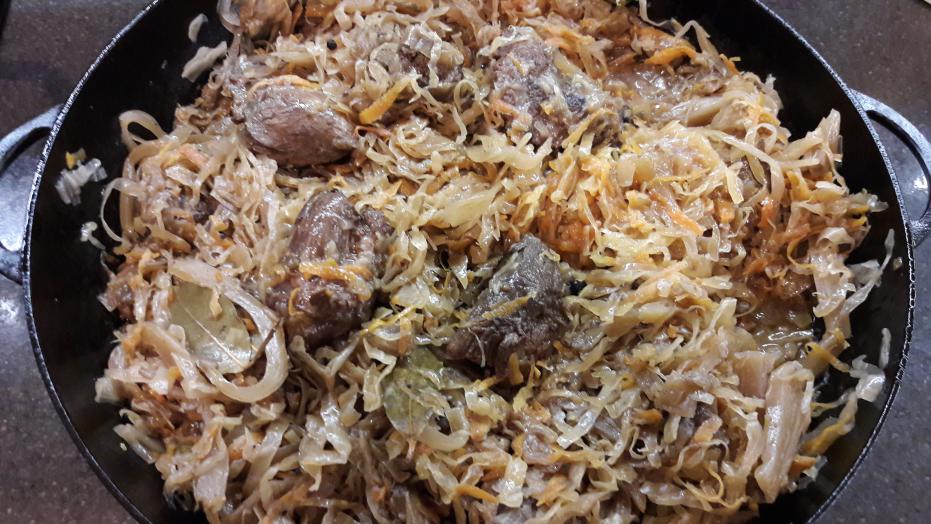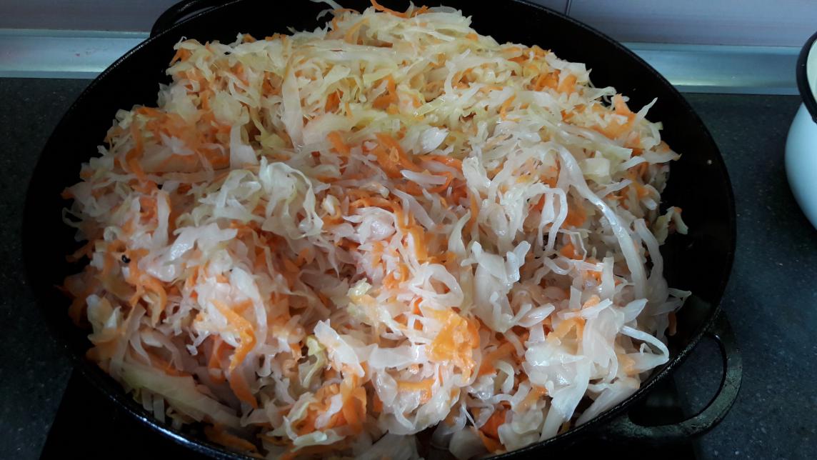 .... закладываем квашенную капусту собственного приготовления и тушим под крышкой дальше. НЕ СОЛЮ, т.к., капуста соленая.! В конце готовности добавляем лавровый лист и оставляем дойти.