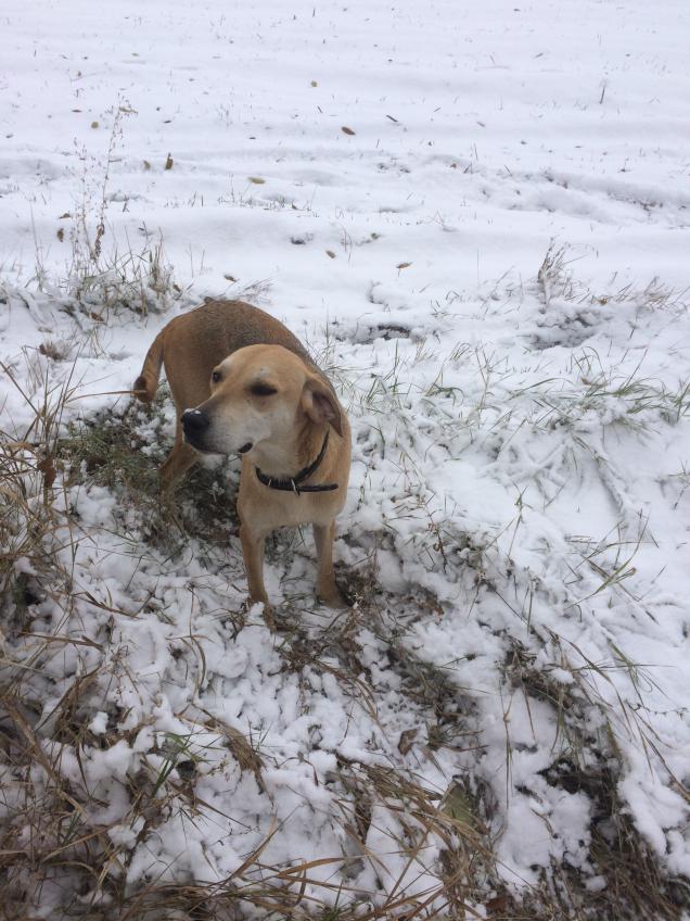 В субботу 28/10 выбрался на охоту. Один подъем косого, лежал в колке с плотной травой, встал в трех метрах, но из-за высокой травы и моего мастерства стрельбы (не привыкну к новому ружью), я по нему, благополучно смазал, но как оказалось ,все же немного зацепил. Пару часов и подранок был добран, благо собака помогла и наличие снега. Собака после долгого перерыва все еще толком не включиться в работу.