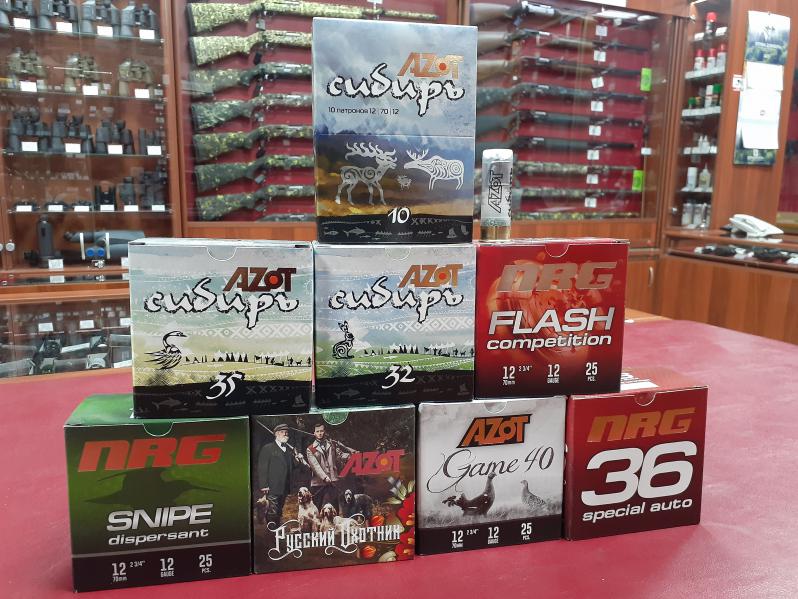 Друзья, в магазине "Оружейный двор" очередное поступление патронов Азот: в продаже серии Сибирь 32гр., Сибирь 35гр., NRG 36 Auto, Русский охотник, NRG Snipe, NRG Flash Sporting 24 и 28 гр., так же пуля Гауланди