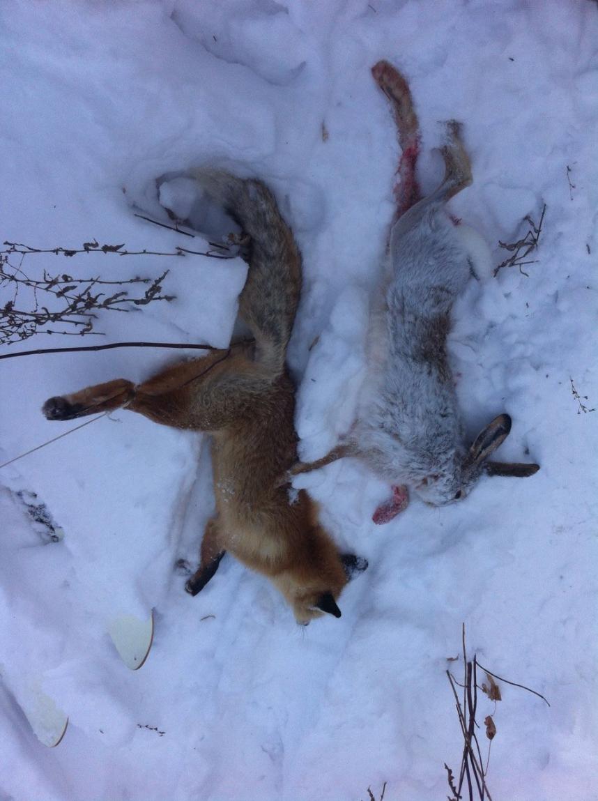 Второго с утреца ,взглянув на берёзу под окном,понял,пора.(Ветви не качаются,ветра нет).След нашёл как обычно ,значит старый знакомый.Примерно через час тропления подн ялся зая ,но далековато.Отдуплетил так для очистки совести,поставил выжлеца,и скорей к началу посадки,любимое его место лаза.Уже неделю с ним играем в догонялки,знаем повадки друг друга.Первый тайм за ним,свернул не доходя до края посадки,опять выстрел в бок метров с 60,мимо.Пока собака выправляла сдвойку в посадке я пошёл по следам.На поле прекрасно видно как заяц мастерит,всё на виду.Вот выжлец разобрался и голося ,догнал меня.Я дальше не пошёл.Наблюдал как в поле он в очередной раз поднял заю.Причём после подъёма был так близко,что я подумал,может догнать зайца.Но тот поддал и ушёл из вида.Вернётся ,подумал я и опять пошёл на старый номер.Закопался в снег,сижу жду.Через минут 20 слышу гонит по посадке на меня.И опять не дошёл ,свернул .По голосу я определил,снял лыжи,зашёл в посадку,Вся надежда на собаку,а то что пролезет тут зай ,сомнений нет.И точно сделав петлю зая ковыляет периодически оглядываясь прямёхонько под ноги.Подпустил метров на 30....Стою над ним как победитель (всё таки сделал я его)Целую неделю водил за нос,и меня и собаку.