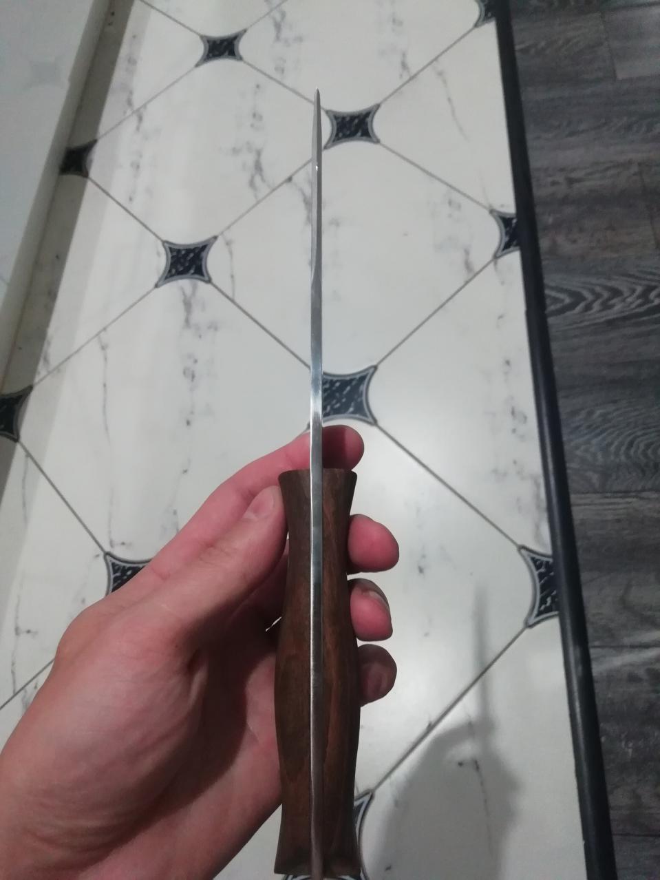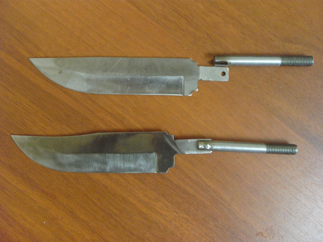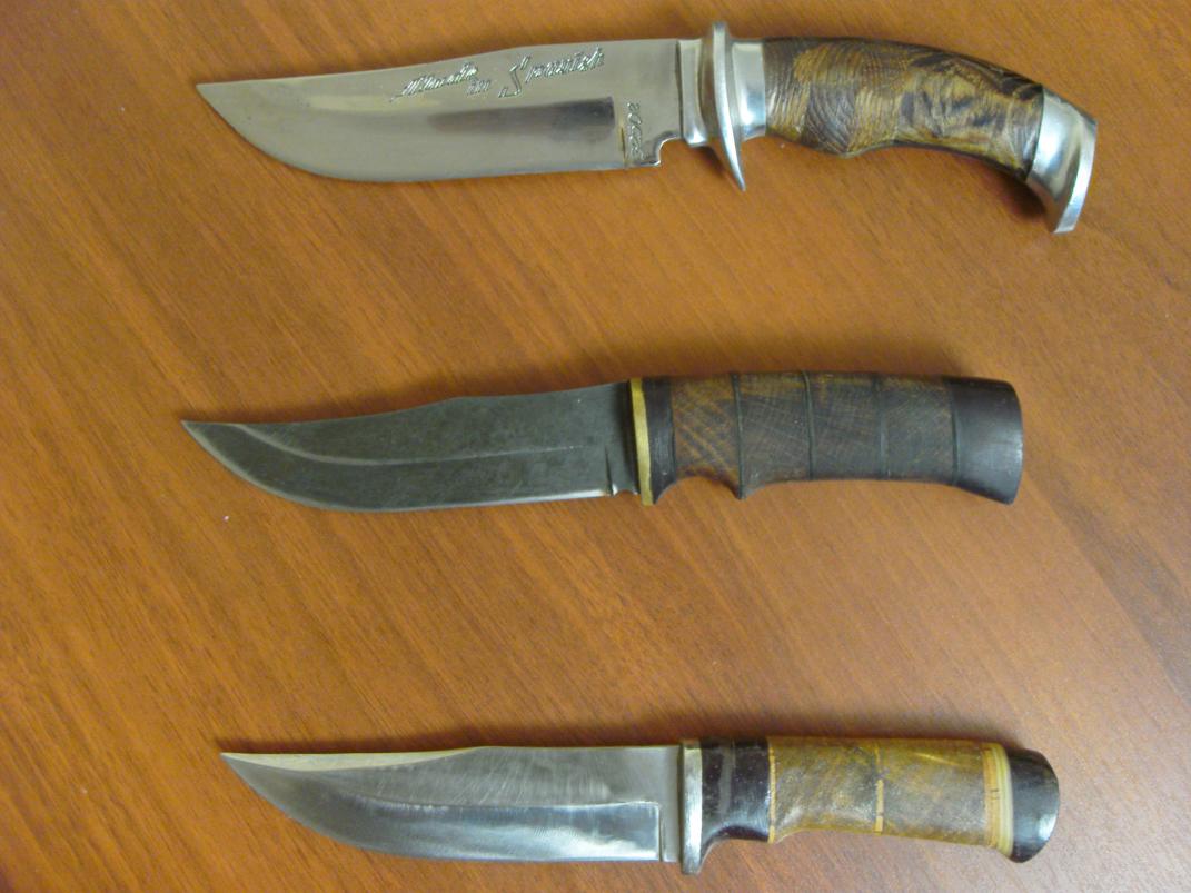 Разрешите и мне показать некоторые поделки. Верхний нож изготовлен из 95х18, планировался как подарочный экземпляр, но так получилось, что он у меня остался и стал основным на охоте, твердость в пределах 50-55 единиц. Заточку держит хорошо, на мой взгляд получился не плохо клинок. Как рабочий, изначально, был не совсем удобный, но в последствии привык к нему. Два нижних сделаны из "быстрореза," тоесть Р6М5. В гараже на глаза попались дисковые отрезные фрезы по металлу, вот и решил попробовать, раньше с этим материалом дело не имел. Трудный материал, хватило терпения на два ножа, две заготовки еще остались, желание появится доделаю. Один зачернил в лимонке, думал все сойдет, но уже как пол года держится, проверку проходят на кухне. Ножи хорошие, но только быстро покрываются коррозией, после работы приходится вытирать от влаги.