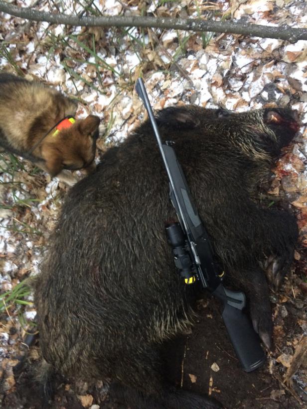 А тем временем мы провели очередную загонную охоту в Самарской области. Три шикарных загона и не менее шикарных трофея: секач и два подсвинка. Стрельба велась с Тигра (7,62х54) и ИЖа 27. Отличная работа собак и стрелков. Секача добирали вместе, поэтому на фото и мой карабин)))).