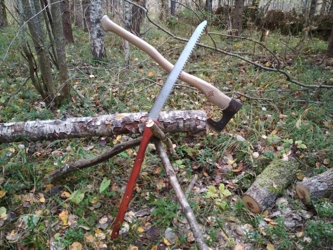 Для ходовой охоты как бы не нужны такие девайсы, но для жизни в лесу очень удобны. Сделаны своими руками. Топор друга переделан из топора для Советской армии выпуска 1952 года. При Сталине твердость каждого топора проверялась дважды: клинок и обух. Рукоять моей пилы тоже самодельная. Полотно японское. Шайтан-пила. У друга такая оригинал. Козлы? Ну ессно самодельные)). Хотел разместить в полезных самоделках, но тут похоже ближе к теме.