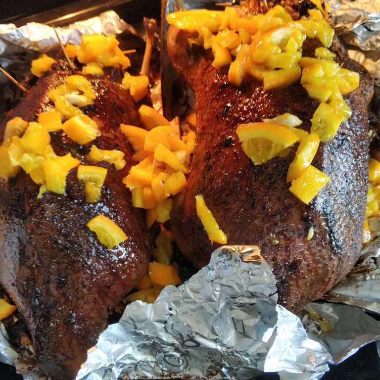 Гусь и селезень фаршированные патрошками, рисом, луком и грибами. Короче сразу пишу - блюдо ОГОНЬ! Реально рекомендую. Рецепт: отмочил в холодной воде слегка подсоленной тушки гуся и селезня (весенний сезон 2018г.) - сутки. Натер их специями (по вкусу) и оставил на пару часов. Патрошки не выкидываю, поэтому нарубил их мелко, обжарил... К ним добавил лука (много) и шампиньонов обжарил. Рис отмочил пару часов смешал со специями: куркума, зира, барбарис (все чуть). Далее набил тушки этой заправкой рис+грибы с патрошками и луком, зашил. В духовку на 2,5 часа на 200 градусах в фольге, еще 30 минут без фольги. Поливал все время жиром. В конце полил пожаренными апельсинами - огонь соус, мой любимый! Вообщем вегетарианцы ели даже)))))!