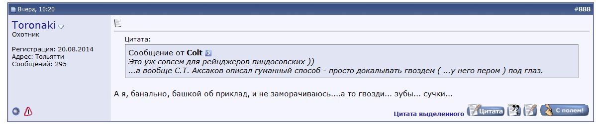 И вообще на охотничьей форуме процветают только околоохотничьи темы- по простой причине охотников на сайте осталось совсем немного. Туристы, стрелки, люди имеющие формальное право владения и ношения оружия- их сейчас нет в угодьях ( я лично этому очень рад) - они все на страницах " ганз " прочих форумах, учат других таких же как и они, как лучше охотиться и кто больше охотник, вместо того чтобы поехать на настоящую, любую охоту ))- и поделиться своим успехом или неудачей с соратниками. Всем НПНП! |
