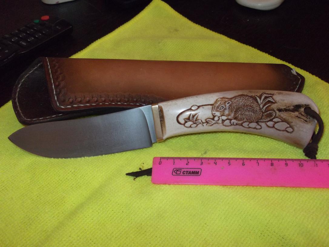 К продаже эксклюзивный нож- исключительно "РУЧНОЙ" работы,в единственном экземпляре Романа Серкова. Клинок-сталь Х12МФ (термическая обработка-закалка)приобретен в этом году на выставке, не полирован,гарда-латунь, рукоять- рог лося, изображение бобра- вырезано вручную с последующим "проявлением", ножны выполнены из кожи ("фанера"),прошиты вручную, тиснение, толщина в обухе около 3-3.5 мм. Цена - 15 000 рублей. Торг возможен....только при осмотре. звонить по тел. +7 девять 27 два 05 6118 . С уважением Сергей.