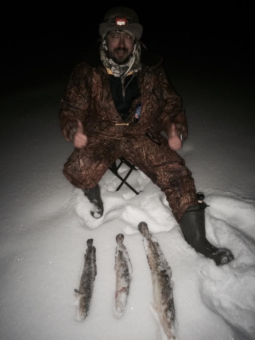 Начали в 16:00 поймал в 17:00 , 11:00,1:30 в 3:00 закончили. Погода супер ! За чьих следов на льду полно.)