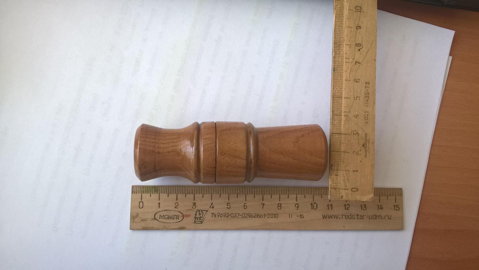 Есть минус один, дерево нужно пропитывать или более тщательно покрывать лаком, потому что при влажной погоде структура дерева увеличивается, и манок не открыть, а при жаркой и сухой наоборот, из за чего было пару раз, что вываливалась тоновая доска. Ну или сделать латунные кольца внутри и снаружи, тогда изменения в структуре древесины будут не страшны. По материалу, дерево скорее всего сосна, на мой взгляд нужно более твердые породы использовать, тоновая доска скорее всего пластик. По язычку не скажу-не знаю! Приложил фото моего манка!