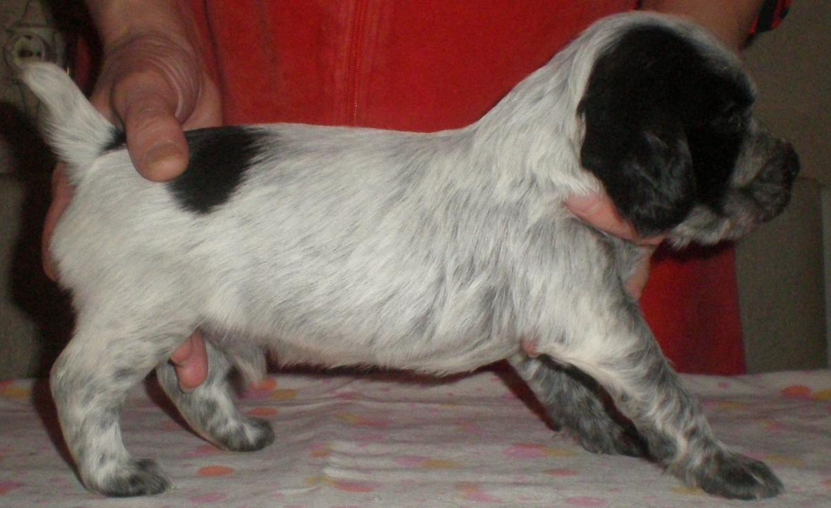 Он белый с черным и есть еще трех цветка, остальные черно-пегие. Три суки и четыре кобелька.