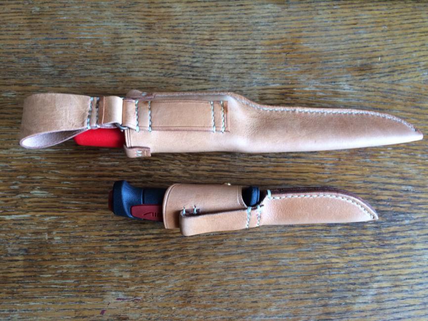 2) Нож мора,для тяжелых работ по замороженным продутам(мясо рыба),отлично подойдет для любых хоз быт работ,походов,ну и конечно охоты. Длинна клинка 150 мм,толщина 2,5 мм.ширина 22мм,угол заточки 23%,сталь высоко углеродистая,с завода нанесено какое то покрытие ,нержавеющая,хвостовик в рукоятку входит на 3/4,не выломаешь при желании. Рукоять крупная,под любую руку подойдет,материал полипропилен,цвет красный(захочешь не потеряешь в лесу)!. Ножны шил на заказ,с двумя подвесами,на ремень и свободный,натуральная кожа. Без походного пробега,дома мяса прибалдел порезал)! даже в жирной руке сидит уверенно,передний под пальцевый упор сильно развит,но сделан под таким углом что не мешает работе с продуктами,для людей сделано,нож очень могуч и резуч. Цена с ножнами 1700р. При покупке обоих ножей,небольшой торг.