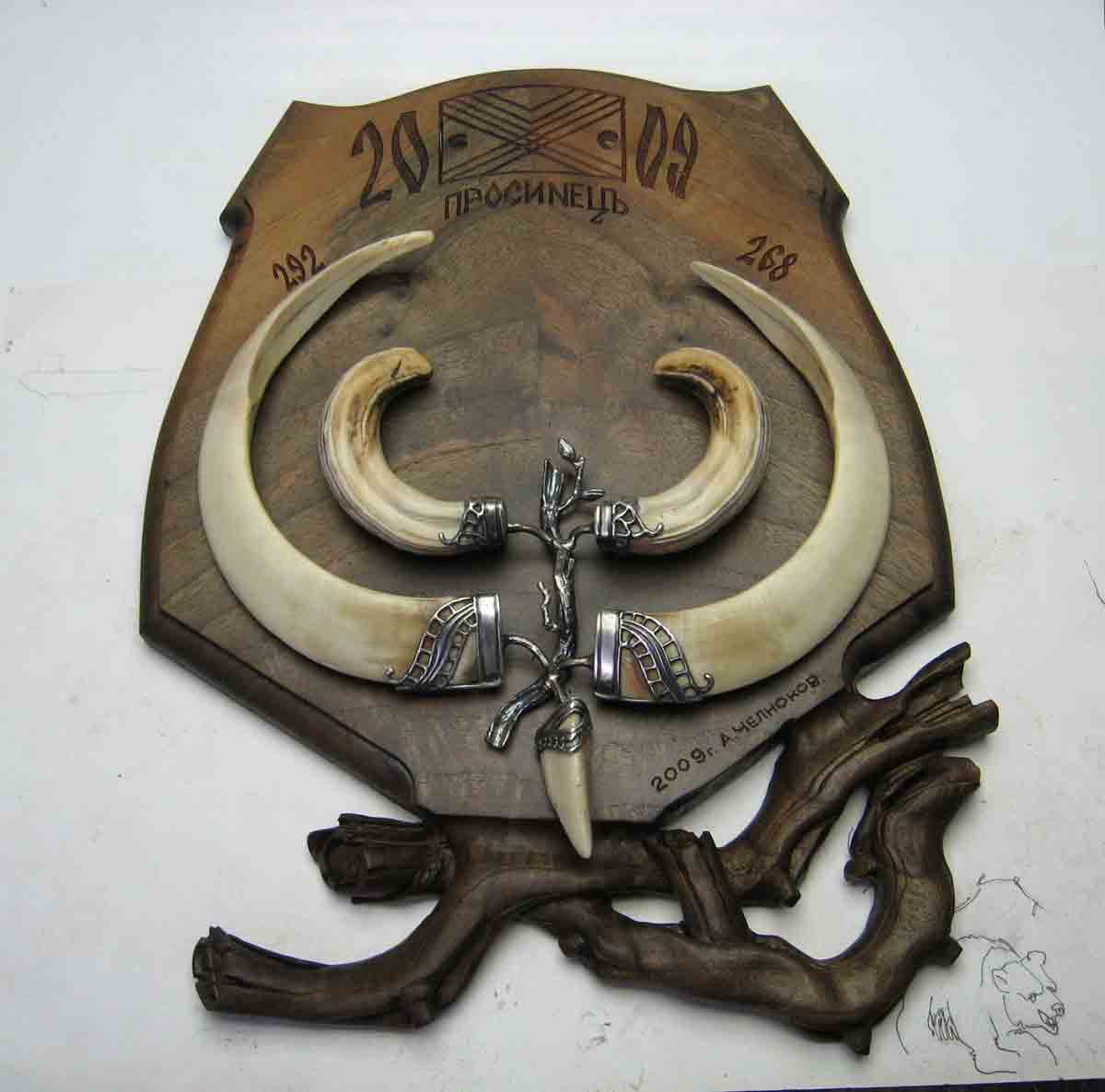 - сварить - извлечь - обезжирить - покрыть защитной пленкой, чтобы не трескались - залить пустоту ................ Это сохранение оно стоит $ 100. Если привезете свой медальон, укреплю бесплатно и трофей готов .. Не дорогие медальоны можно сделать самому или заказать в любой cтолярке, цена примерно 300-500руб. Некоторые заказывают сразу 10-20 шт. и крепят все подряд клыки, а для самых крупных и красивых делают медальоны резные из ореха. Резьбой у меня занимается отец, он вырежет любой медальон и посоветует эскиз, цена зависит от сложности. Оформить на простой или резной медальон решать Вам, в любом случае - Это ВАША память об охоте, которую не вернешь.. Кто бывал на охоте в Европе видел оформление замков ((фото Чехия, музей охоты)) Доставить мне можно всю голову, отрубить под уши, или срезать лишне, как на фото с телефоном. ((( Клыки нижние примерно 70% находятся в челюсти, рубить нужно - МЕЖДУ ГЛАЗОМ И ЗУБОМ ))) при срубке, в рот поперек засунуть палку, чтобы зубы не сломались друг о друга... удачной охоты.... Последний раз редактировалось StuDent; 24.01.2012 в 10:50. |