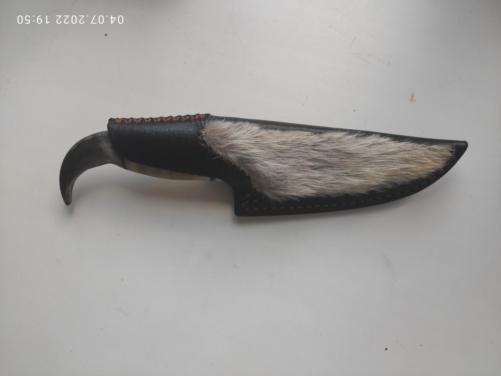 Нож работы Барнаульского мастера Вадима Ефремова, сталь клинка клапан (кованный), рукоять рог лося, навершие коготь медведя, ножны кожаные со вставкой меха волка, подвес ножен свободный.