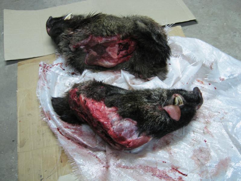 - Хочу порекомендовать начинающим охотникам "трофейщикам", как лучше !! Не буду говорить ((правильнее)) правильно у всех по разному, срубать клыки... -голову переворачиваем, извлекаем язык -вставляем палку между нижней и верхней челюстью, чтобы при рубке зубы не сломались друг о друга. -начинаем с нижних клыков, срубаем нижнюю челюсть, отделяем -подставляем что то, под верхнюю челюсть и рубим краем топора (верхняя часть - хрящ) -срезаем лишнюю мякоть. |