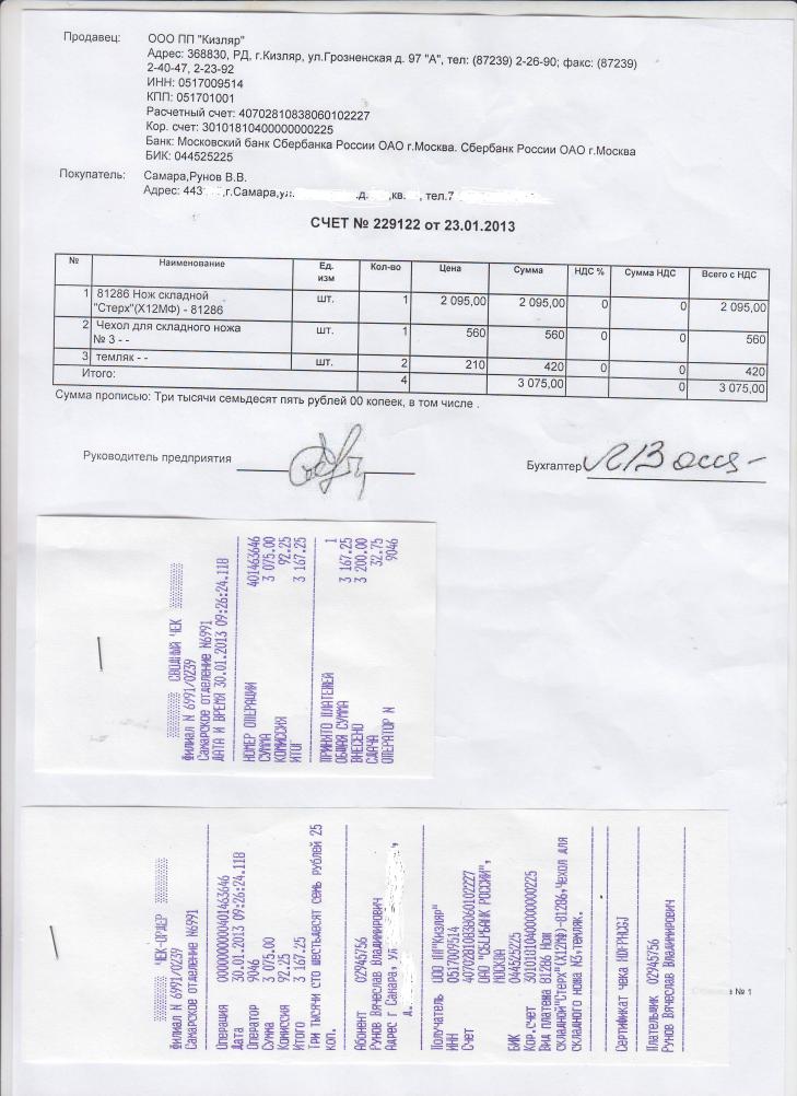 Хотелось бы предостеречь Вас от ошибки, которую совершил сам. Недавно у меня было день рождение и друзья-товарищи решили подарить мне складной нож. Долго выбирали и соблазнились на рекламу из Кизляра. По эл.почте: mailto: menejer@kizlyarmail.ru связались с ними, выбрали товар, получили от них счёт на оплату, оплатили. Ждём! Проходит неделя, другая... в ответ: "Деньги не пришли, ждите" Прошло ещё время. Начал звонить настойчевее, тогда милая девушка Заира дала ответ, что мол такие случаи у них постоянны и мне нужно самостоятельно идти в Сбербанк и требовать отправки денег. В Сбербанк сходил, там меня заверили, что деньги ушли. В общем замкнутый круг. Написал я притензию в банке, дабы отдали мои кровные, подаренные деньги. Если не найдут, на следующей недели пойду в милицию или как там - полицию. Я не сыщик и не имею возможности определить жулика, да и право у меня такого нет (где он там в Самаре или в Москве, а может в самом Кизляре), но Кизлярские товары буду обходить за версту. Лучше купить в магазине приглянувшийся товар, пусть будет иностранный, но сразу в руки, чем вот такие мытарства. Ходи теперь туда-сюда, проси что бы отдали своё же. В приложенном файле подтверждения моих приключений.